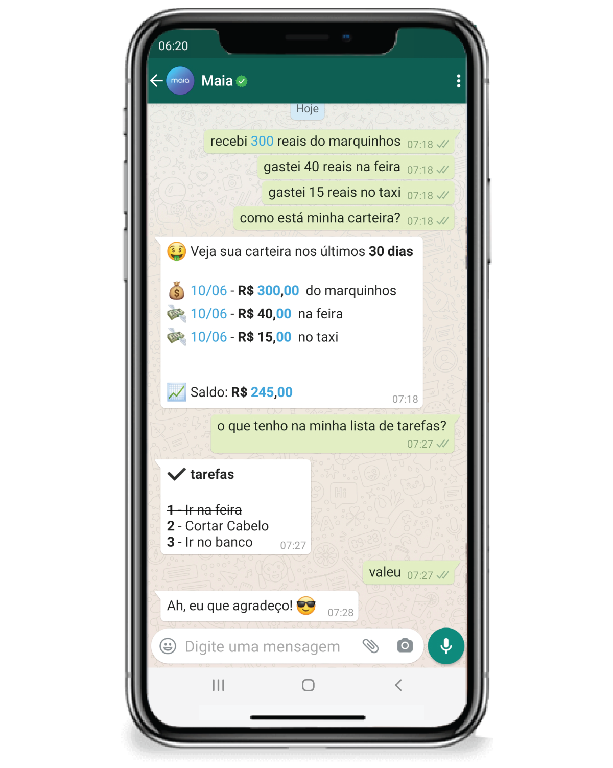 Tudo o que a Maia oferece é pensando na sua praticidade e organização! Você não precisa instalar e nem se adaptar a nenhum novo aplicativo! Uma simples conversa já é suficiente para você ter tudo organizado! 😊